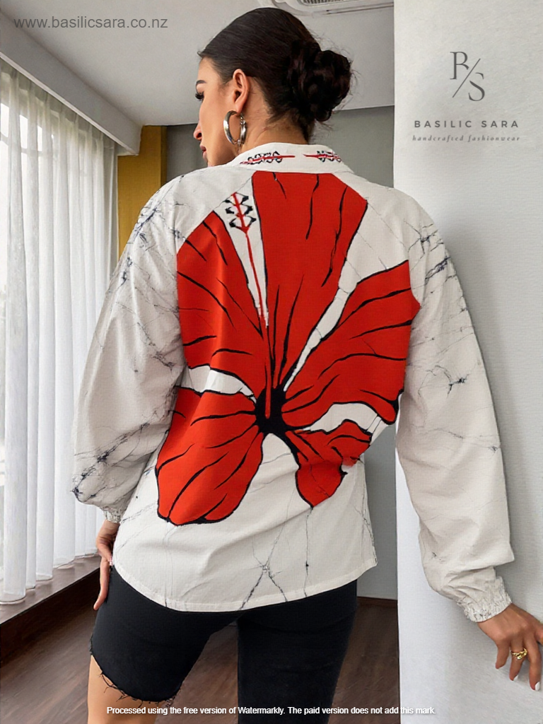 This handcrafted cotton top blends modern structure with artistic expression. Featuring a clean front silhouette with a tie-waist belt and delicate shirred cuffs, it’s finished with hand-stitched detailing at the neckline and sides for subtle texture. The back reveals a striking hand-painted design a bold hibiscus bloom celebrating island nature with bold, clean lines.